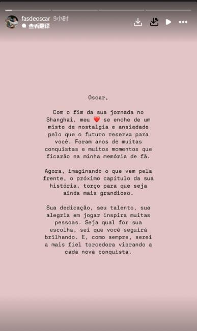 12月20日訊 奧斯卡的國外球迷團(tuán)體在社媒發(fā)告別信,稱奧斯卡在中國的旅途即將結(jié)束。