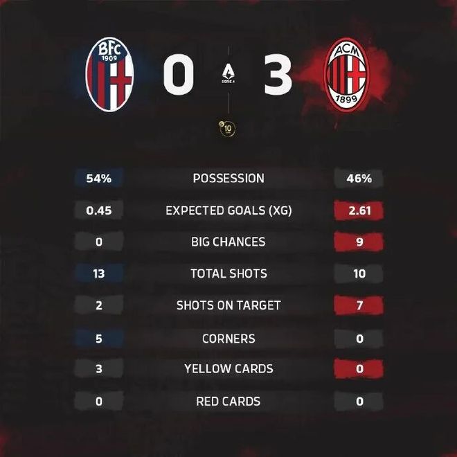 全場比賽結(jié)束,米蘭3-0博洛尼亞。